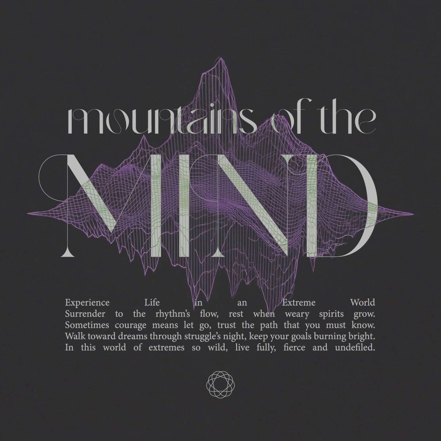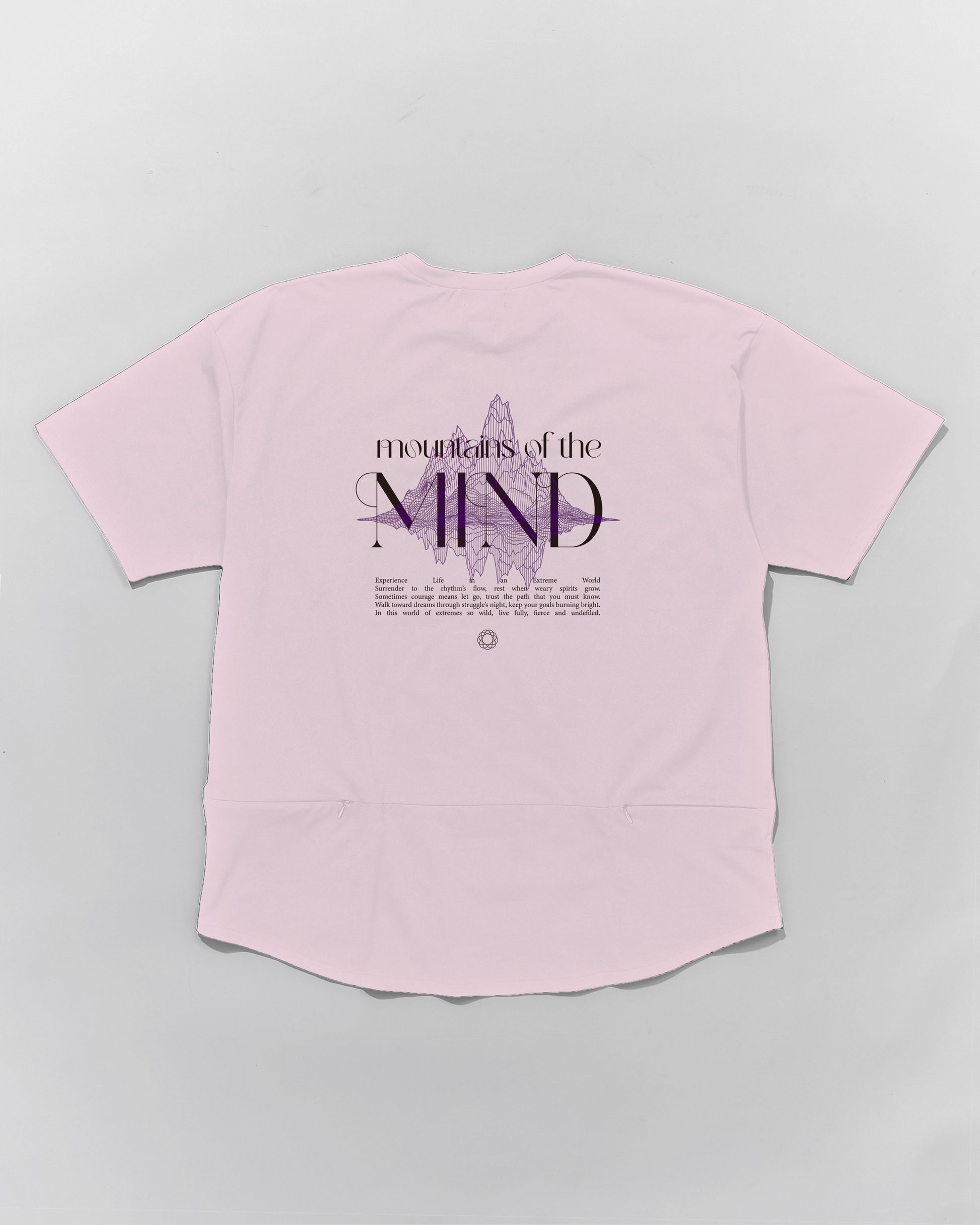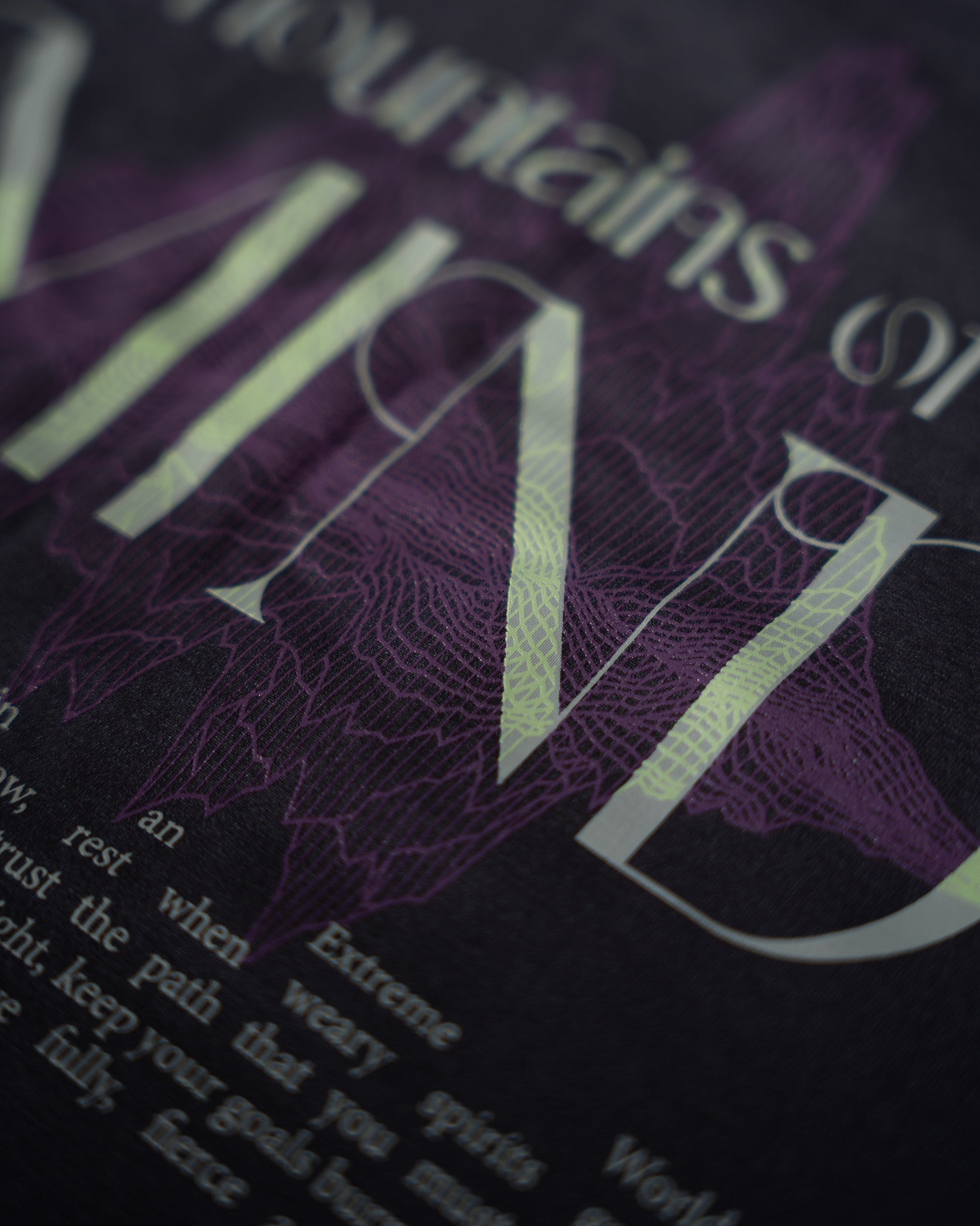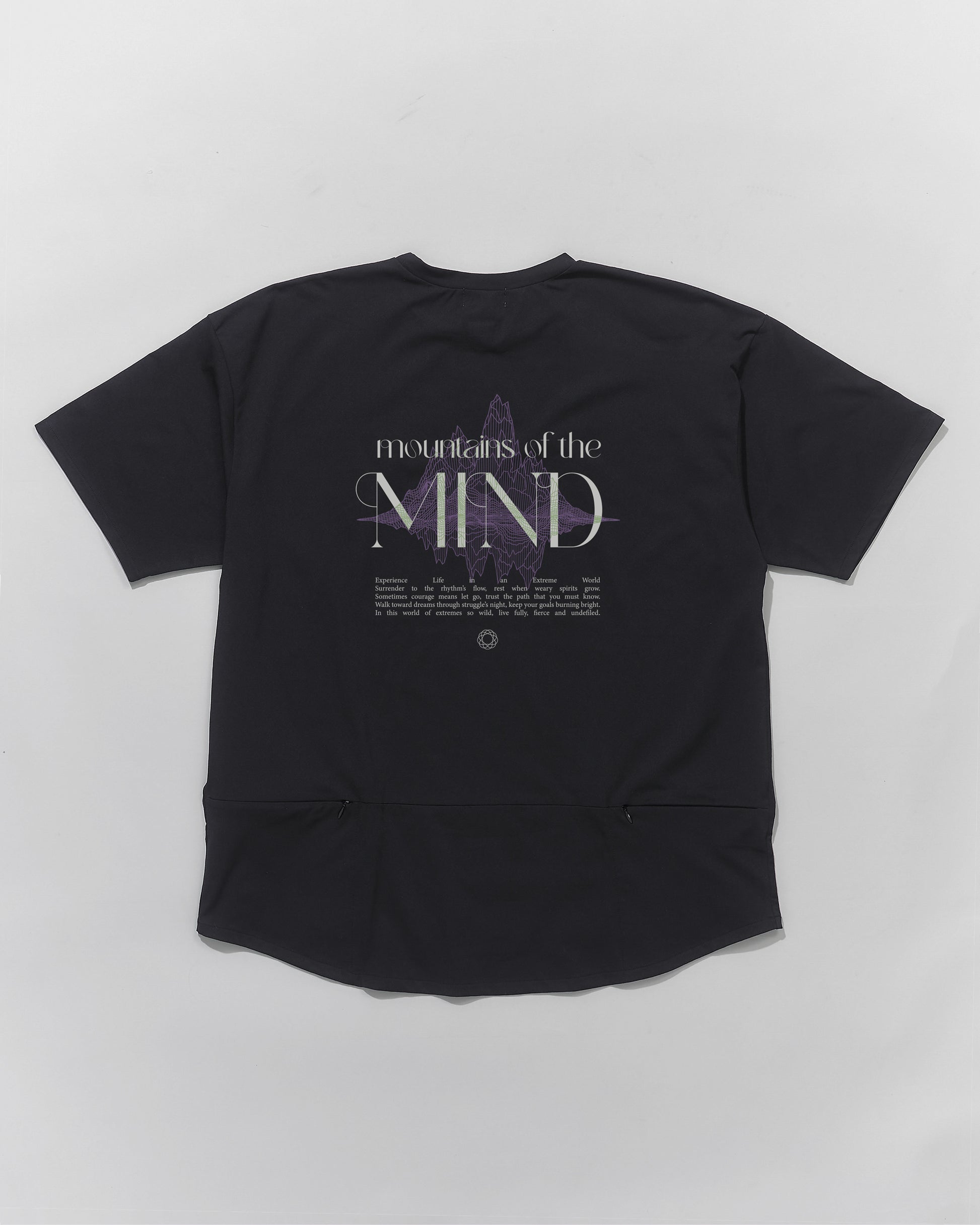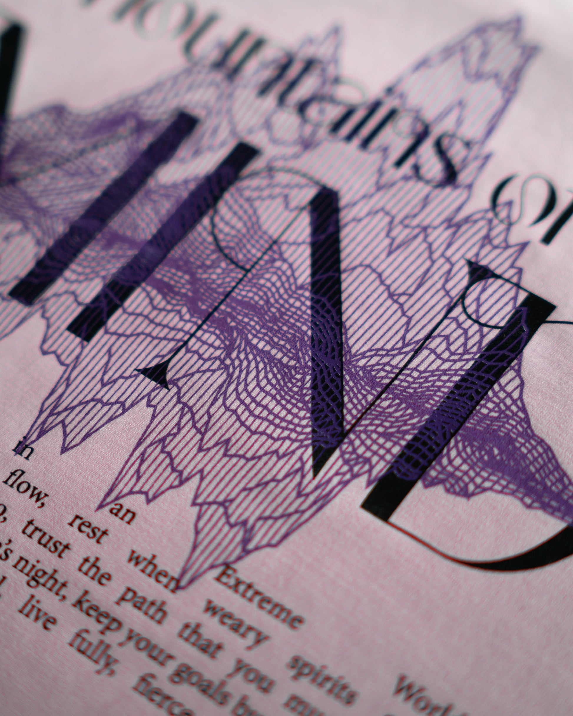 The back print features a silkscreen print of "Mountains of the MIND" graffiti.